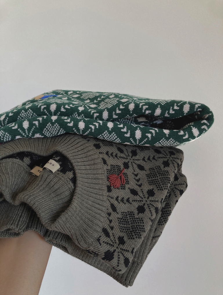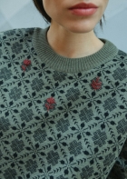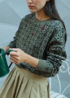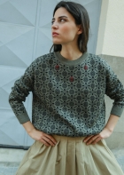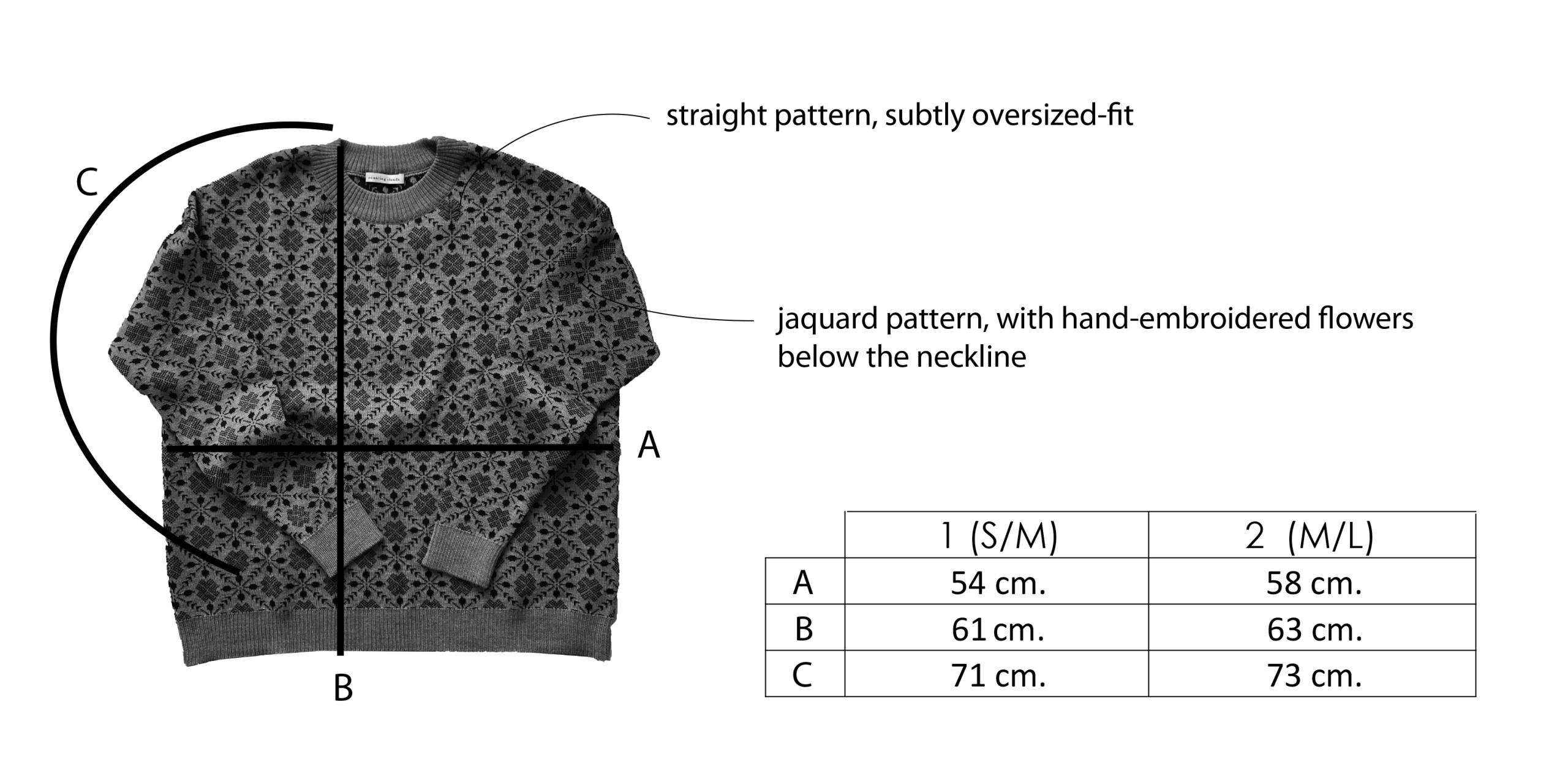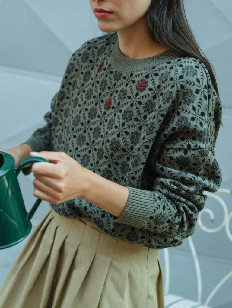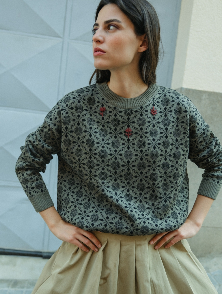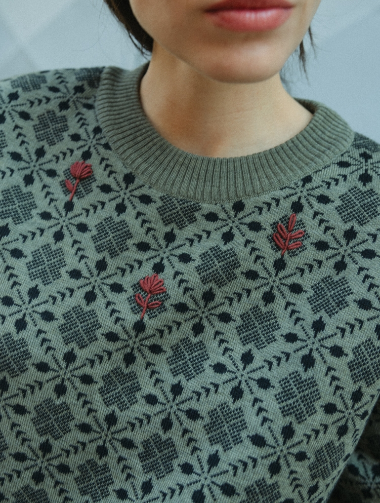 A jumper with a relaxed, basic pattern that looks perfect over T-shirts, shirts, or dresses. Featuring a jacquard pattern and plant-based handmade embroidery, it makes it extra special and delicate.