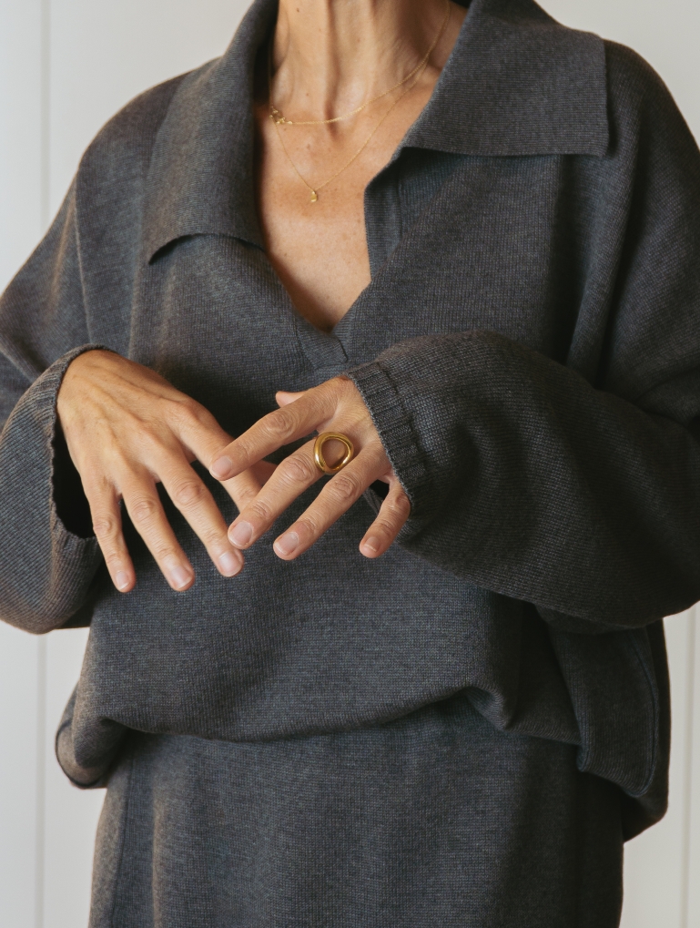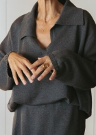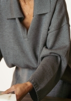 Essence is an oversized sweater with a super flattering polo-style collar. A thoughtful one size design, it’s perfect without anything underneath, or over a light color T-shirt or shirt. A stylish yet comfortable piece.