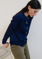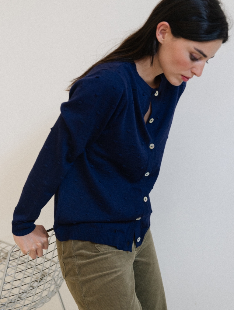 A classic thin cardigan with a beautiful texture. Reversible, round neck, rib in the bottom and a regular fit. An everyday relaxed cardigan, in two basic and flattering colors.
