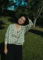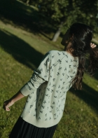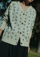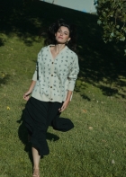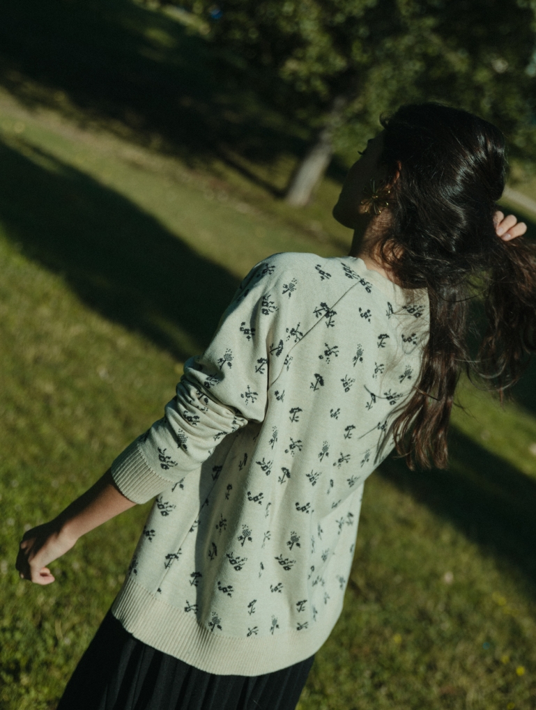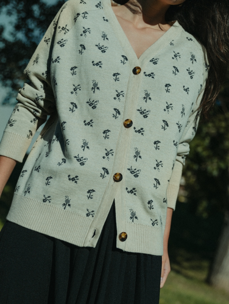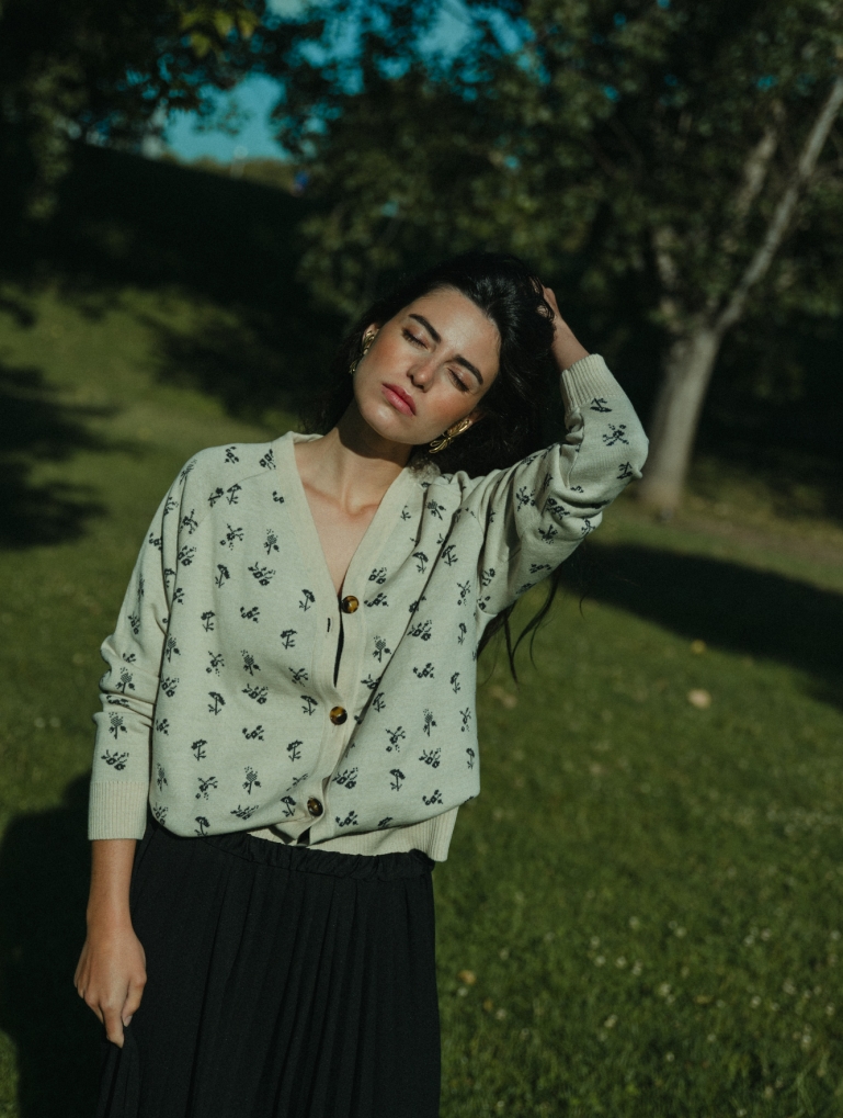 A long, basic pattern in merino wool with a perfect fitting. Featuring a jacquard-knit plant pattern, it’s a truly unique piece. You can wear it as a light outer layer in the fall, or under a coat if it’s colder. Super stylish with the sleeves rolled up, open or closed, it’ll become that cardigan you’ll wear year-round.