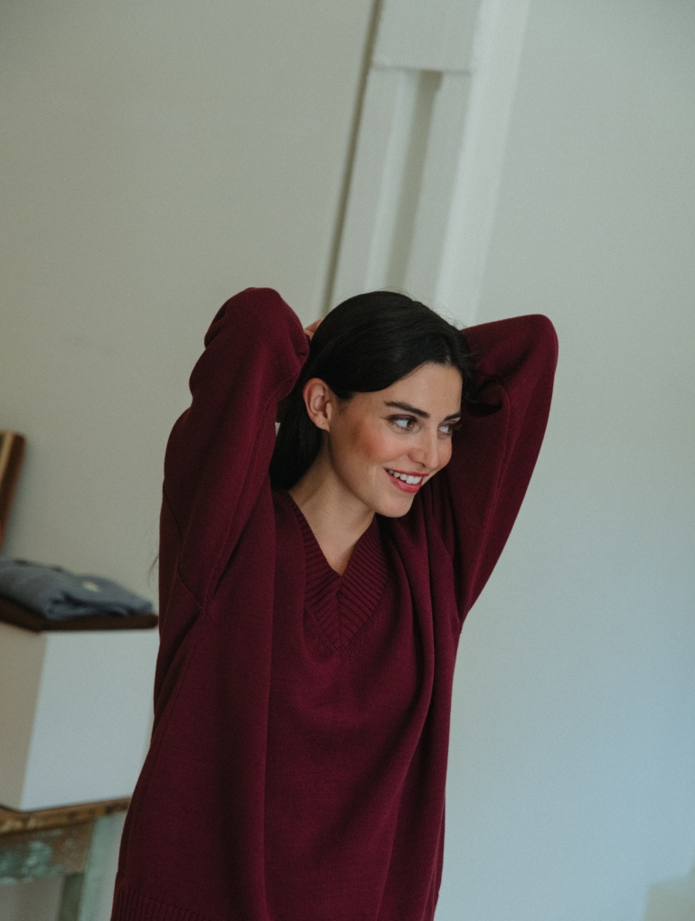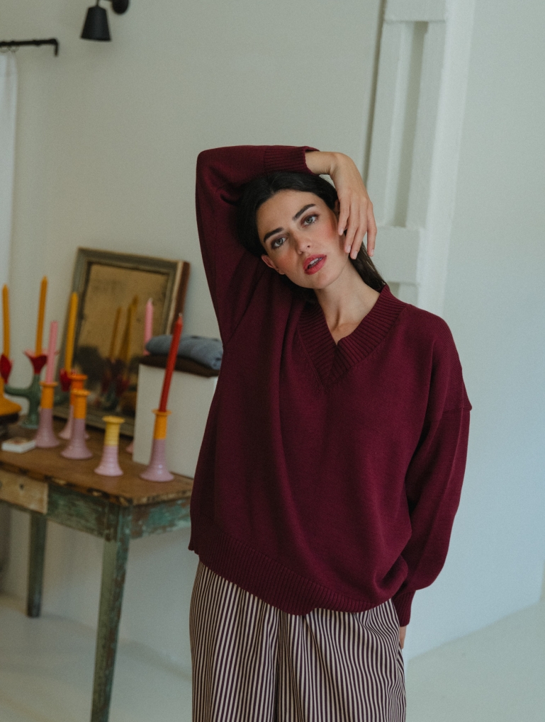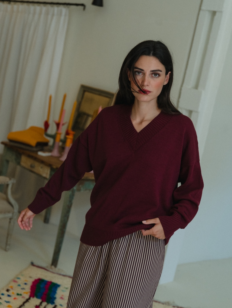 The perfect V-neck jumper. Straight, oversized cut, with a loose pattern that fits wonderfully. Comfortable and stylish, its extra-wide neckline gives it a unique and chic touch.