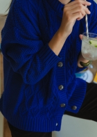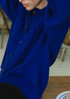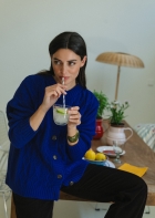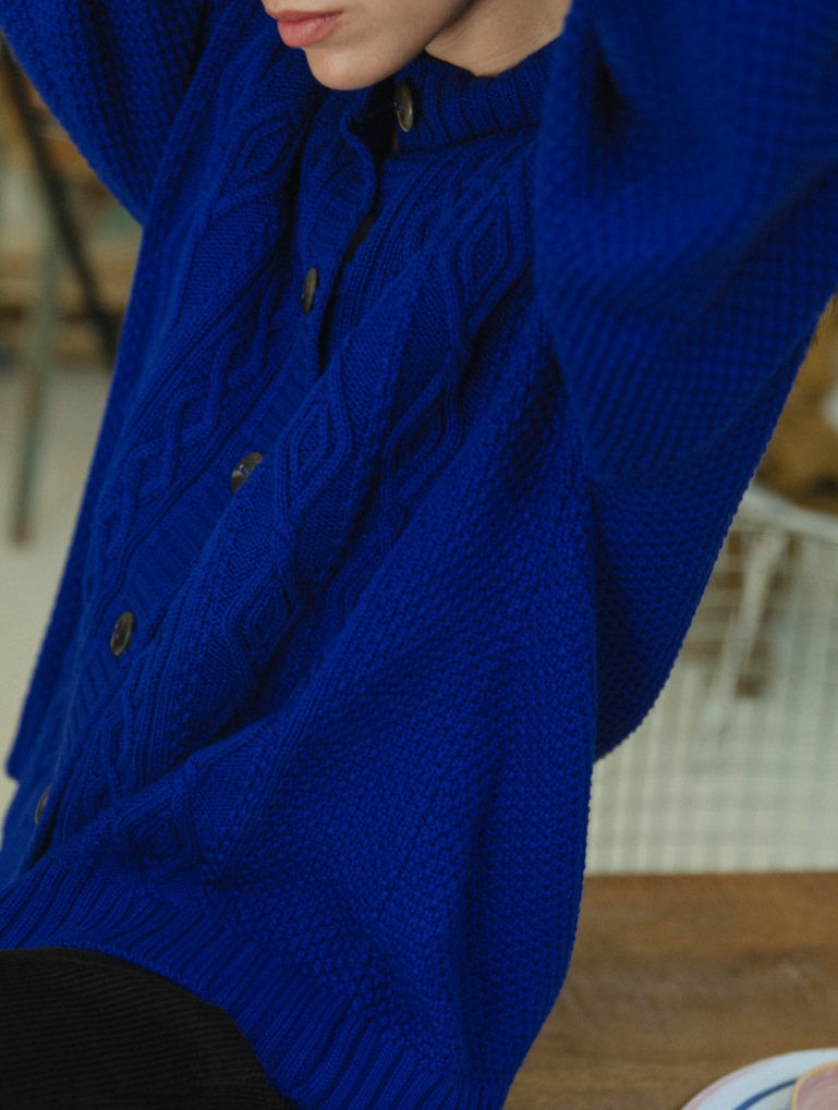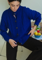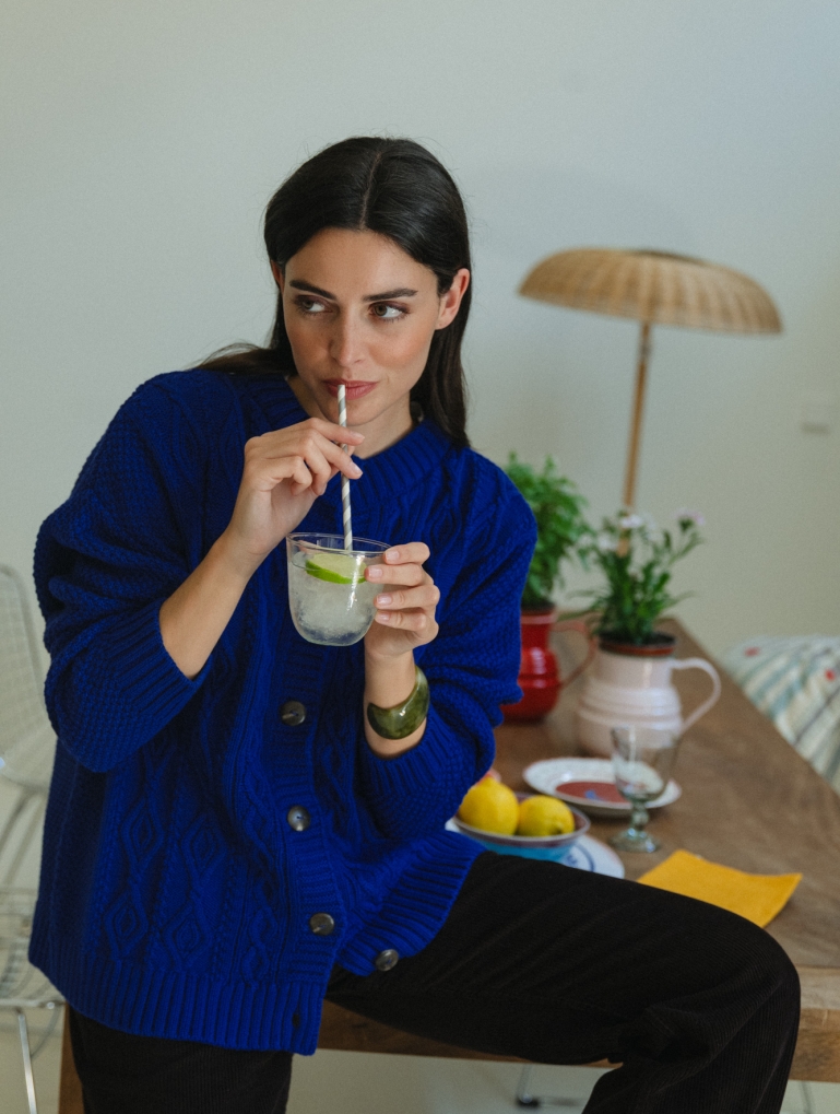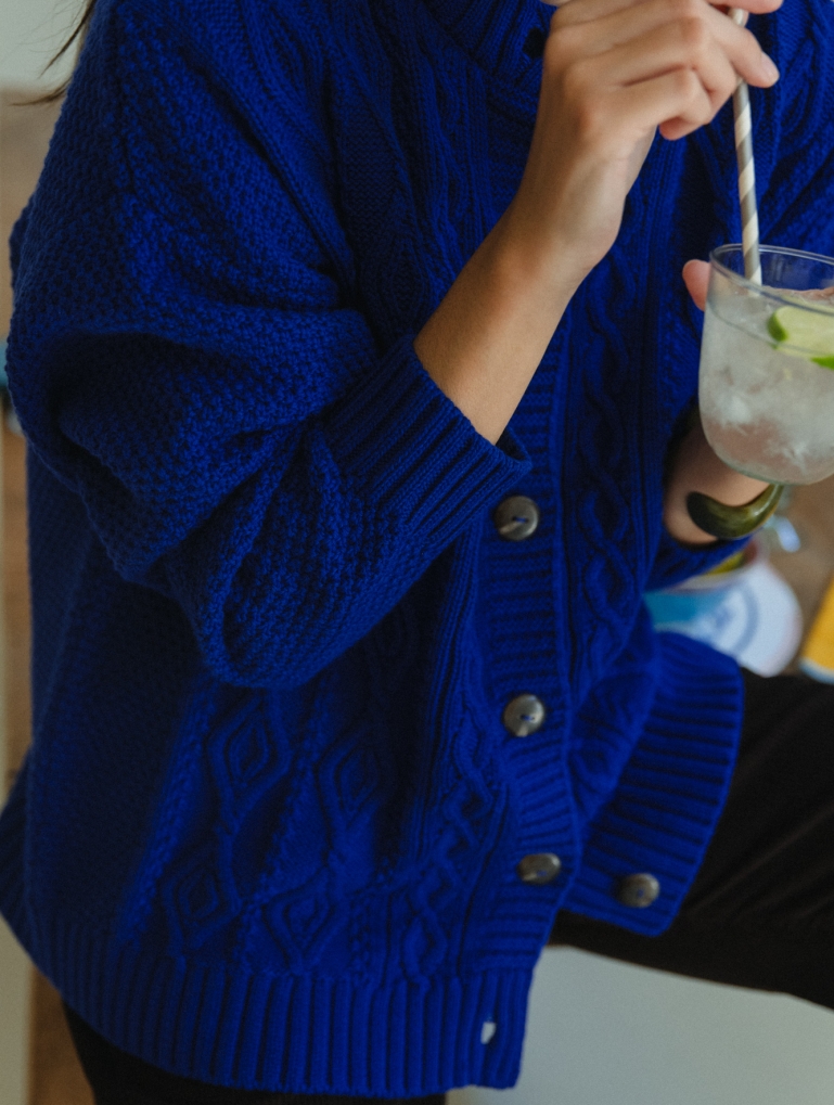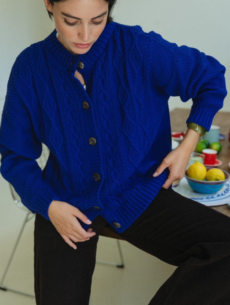 A cardigan knitted in a very soft cotton with a cable knit and moss stitch texture, inspired by the traditional Aran sweaters, that were believed to bring luck, success, and health to the wearer. A very special piece in ideal colors, perfect to wear open or closed and enjoy all year round.