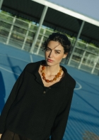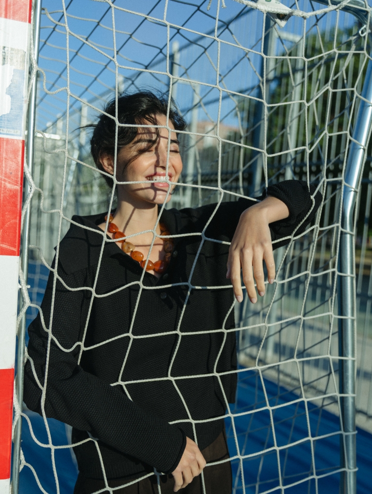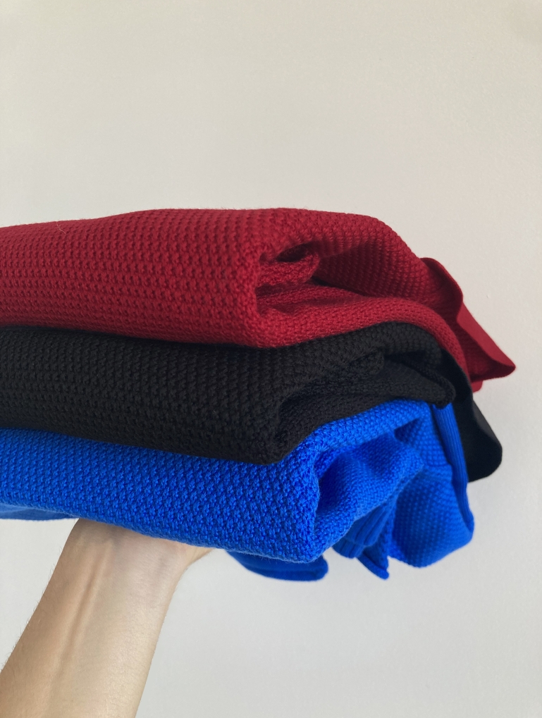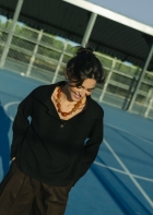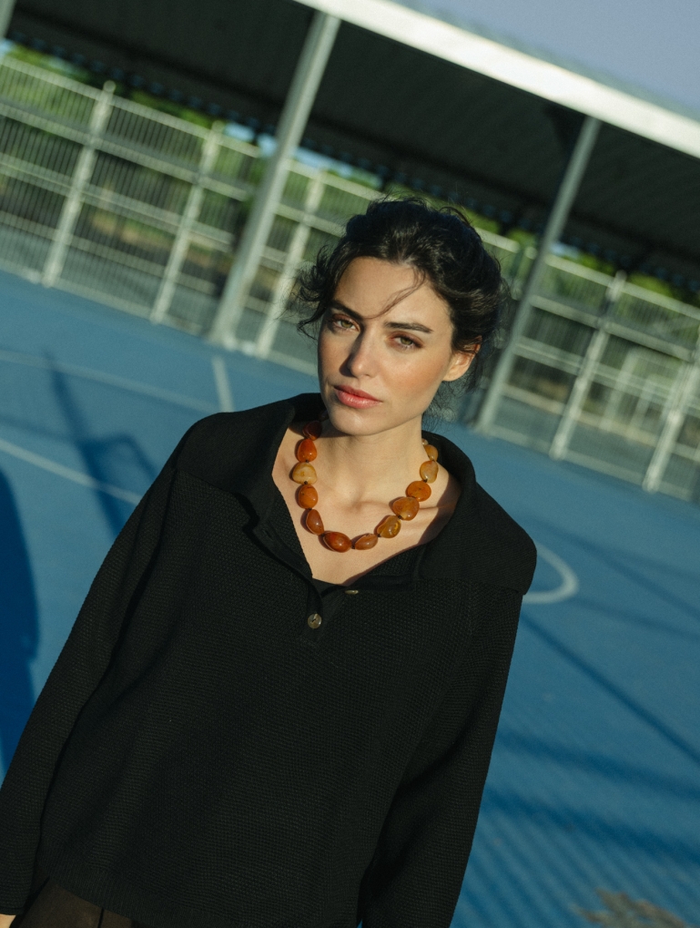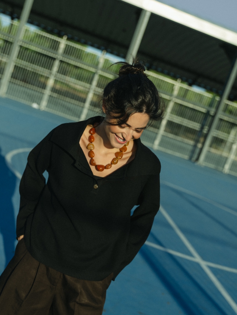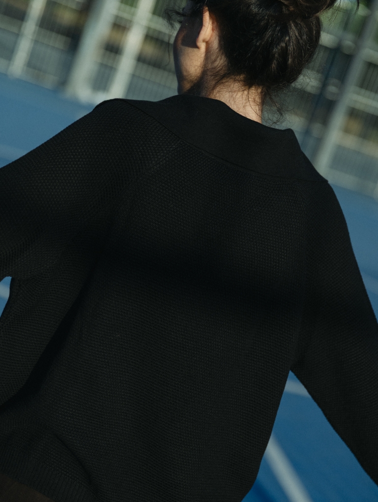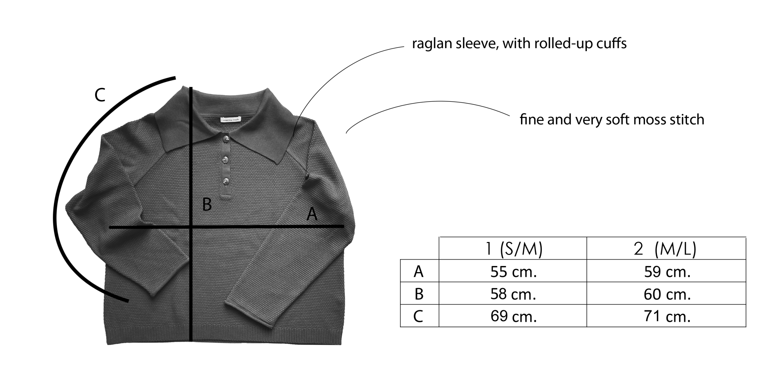 A fine-knit polo shirt packed with details. Raglan sleeves and an oversized collar make it super flattering, whether buttoned up or unbuttoned. Knitted in a moss stitch, with a beautiful texture, and featuring a rolled-up sleeve.
