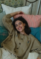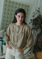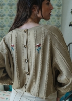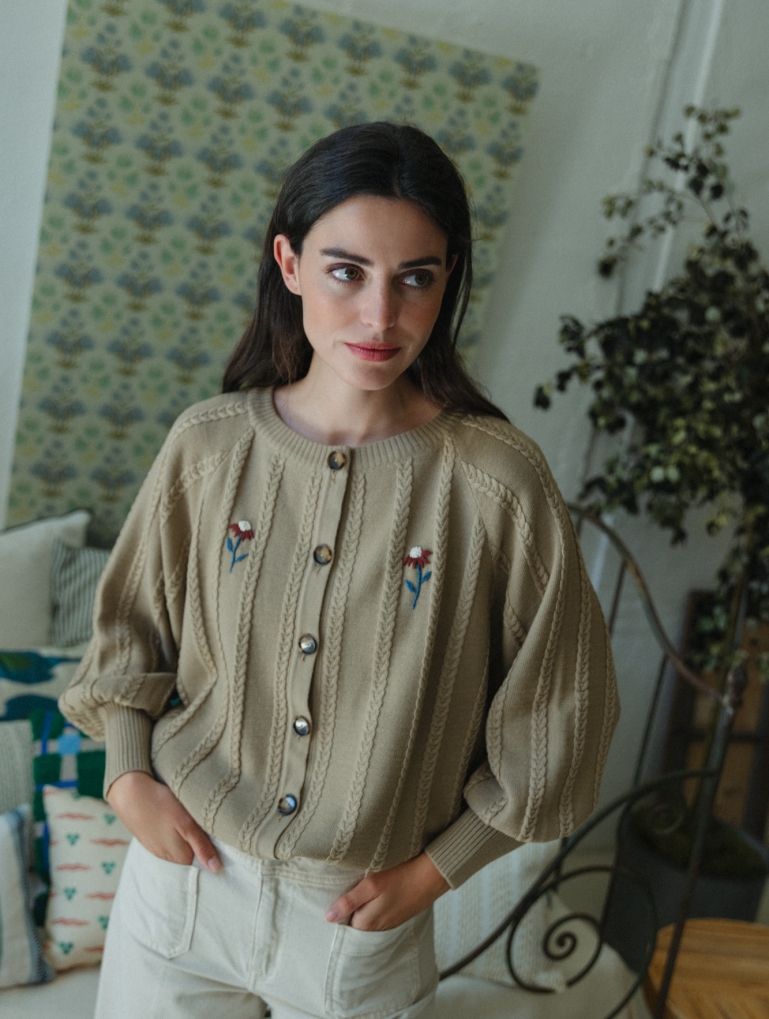 Trenzas is sensitivity. A reversible cardigan with mind-blowing balloon sleeves that make it very special. You can wear it as a cardigan or as a jumper with the buttons to the back. Woven braids on the front and back, and two flowers hand-embroidered in detail with thick merino wool thread.