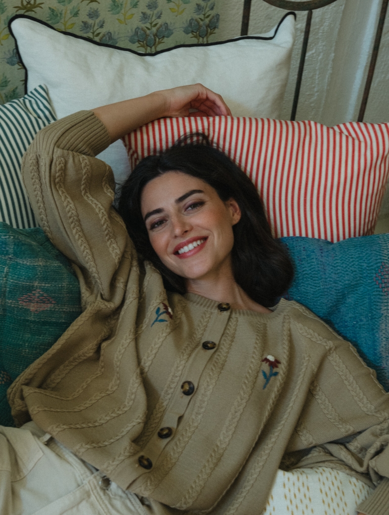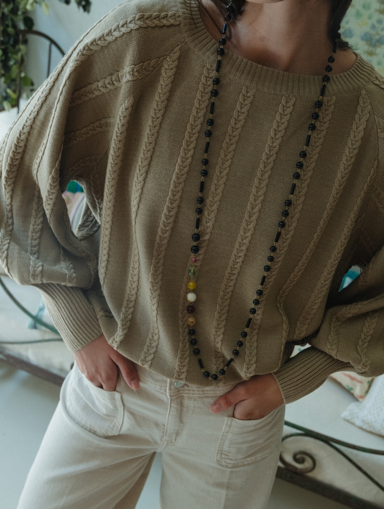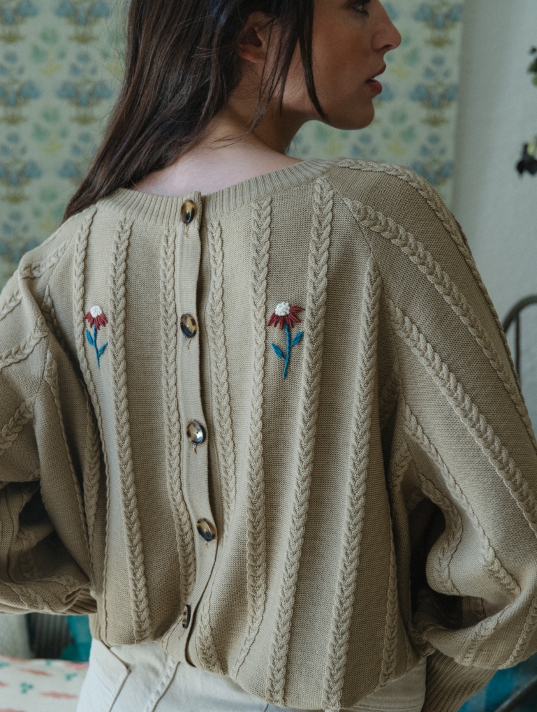 Trenzas is sensitivity. A reversible cardigan with mind-blowing balloon sleeves that make it very special. You can wear it as a cardigan or as a jumper with the buttons to the back. Woven braids on the front and back, and two flowers hand-embroidered in detail with thick merino wool thread.