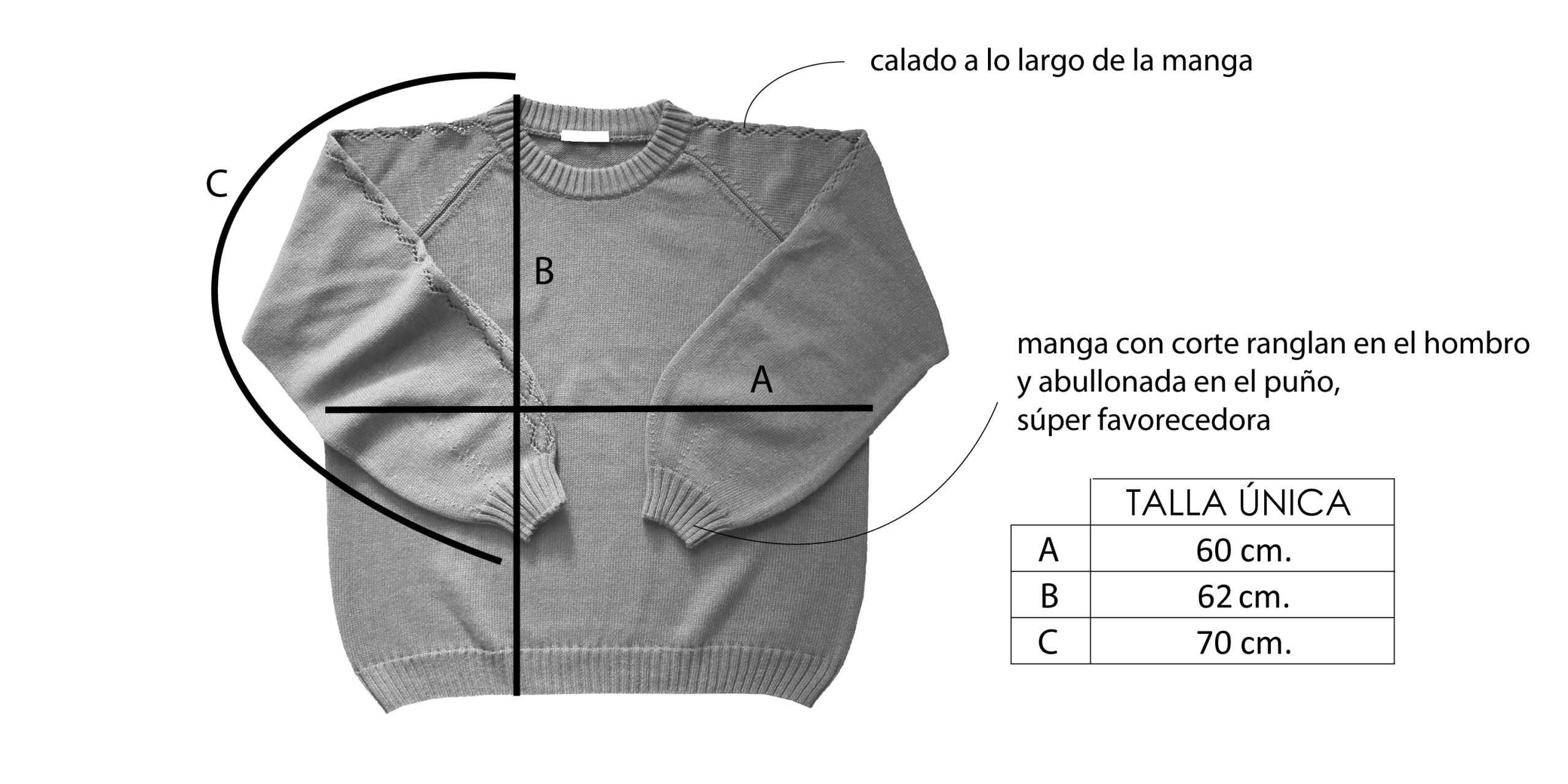 Un jumper tejido con una hilatura muy suave mezcla de algodón orgánico y cashmere. No tiene ninguna costura, lo que hace que este patrón sea muy especial y siente fenomenal. Corte ranglan en las mangas, detalle calado a lo largo de los brazos y puños muy abullonados.