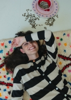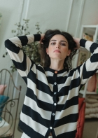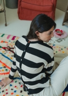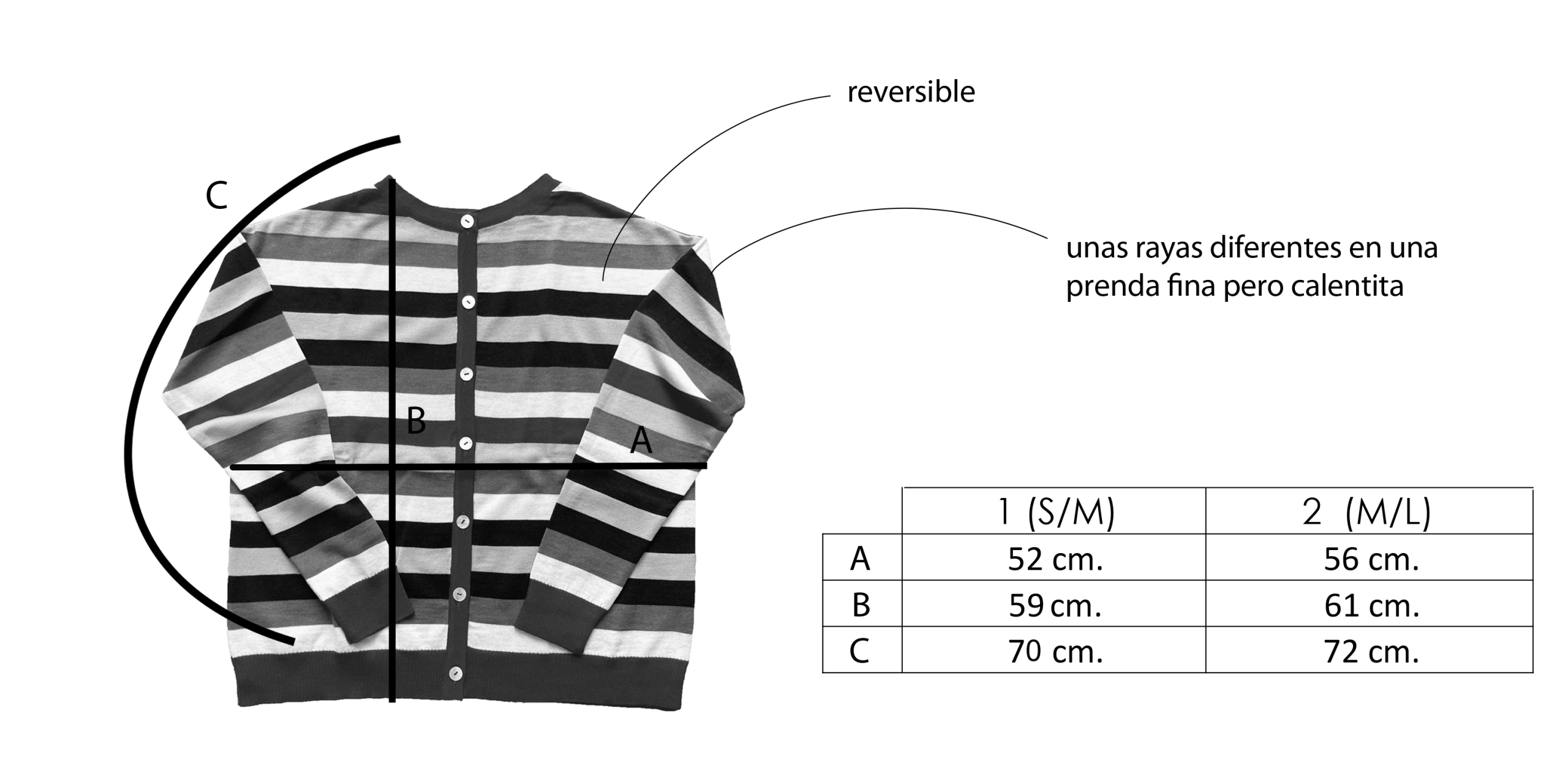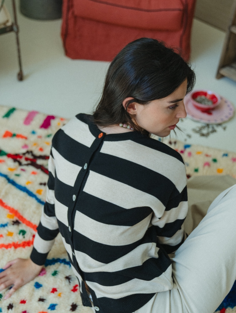 Feria es un cardigan de rayas diferente y reversible. Dos estilos: unas rayas siempre ganadoras en blanco y negro, o una combinación multicolor muy chic. Puedes llevarlo como camiseta o sobre otra prenda para alegrar cualquier look.