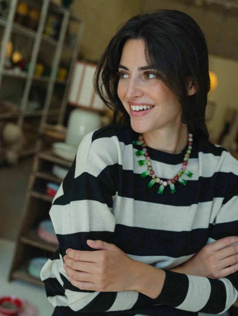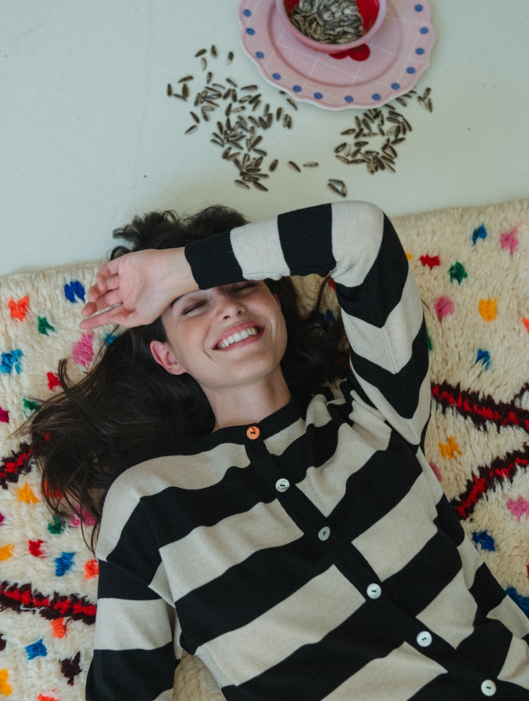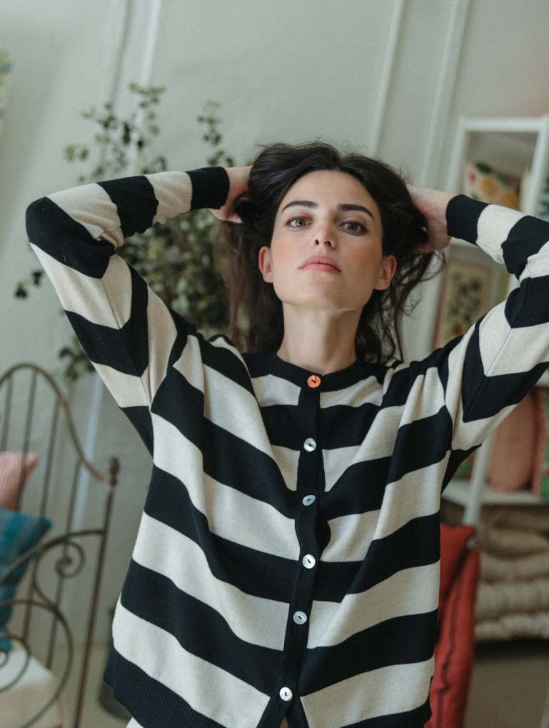 Feria es un cardigan de rayas diferente y reversible. Dos estilos: unas rayas siempre ganadoras en blanco y negro, o una combinación multicolor muy chic. Puedes llevarlo como camiseta o sobre otra prenda para alegrar cualquier look.