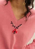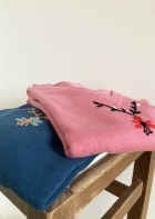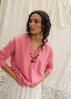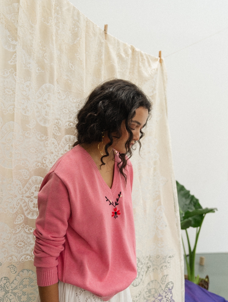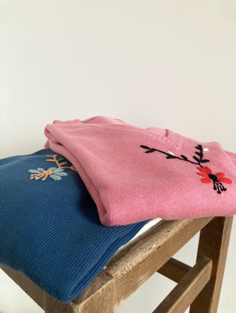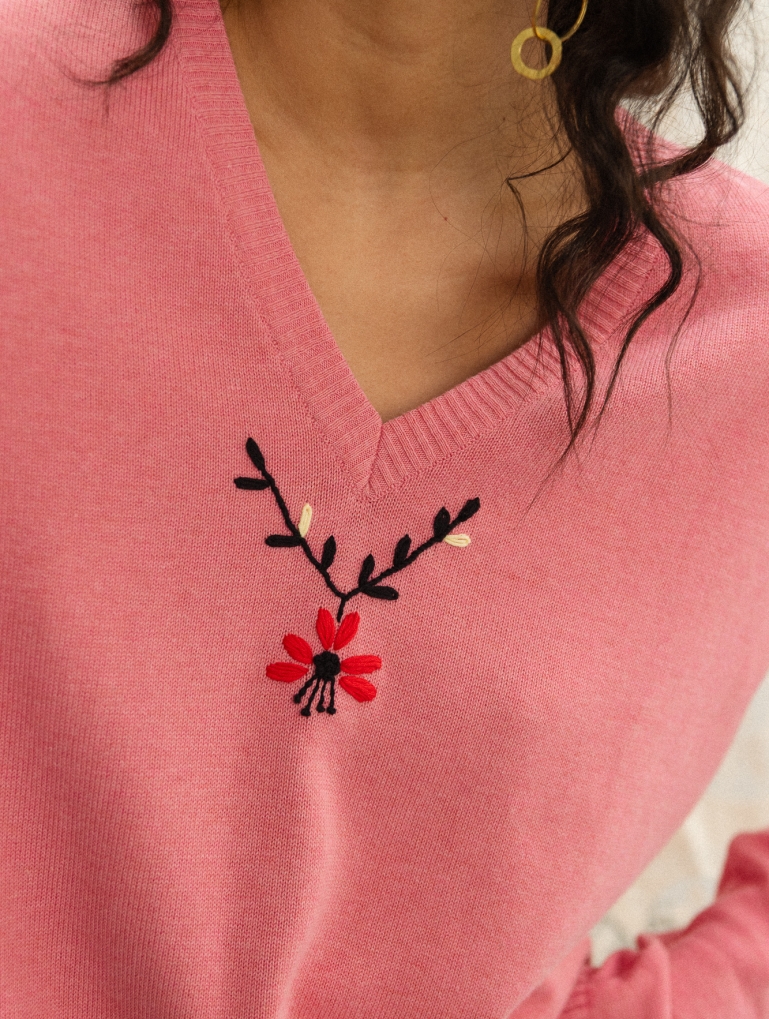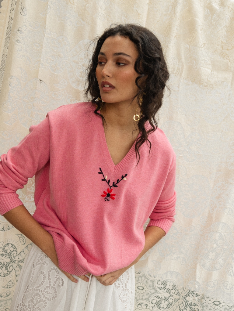 Un jumper con cuello pico y un bordado vegetal inspirado en la artesanía mejicana, hecho a mano con hilo grueso de algodón. Una talla única muy favorecedora, en dos colores vibrantes.