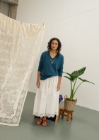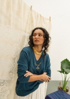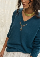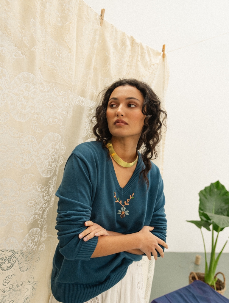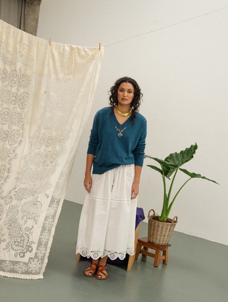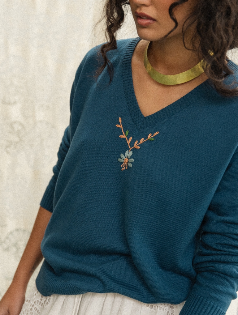 Un jumper con cuello pico y un bordado vegetal inspirado en la artesanía mejicana, hecho a mano con hilo grueso de algodón. Una talla única muy favorecedora, en dos colores vibrantes.