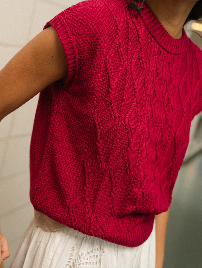 Un chaleco tejido en un algodón muy suave con una textura de trenzas y punto de arroz. Una prenda muy especial en unos colores ideales. Perfecta todo el año, sobre una camisa o camiseta, o sin nada debajo.