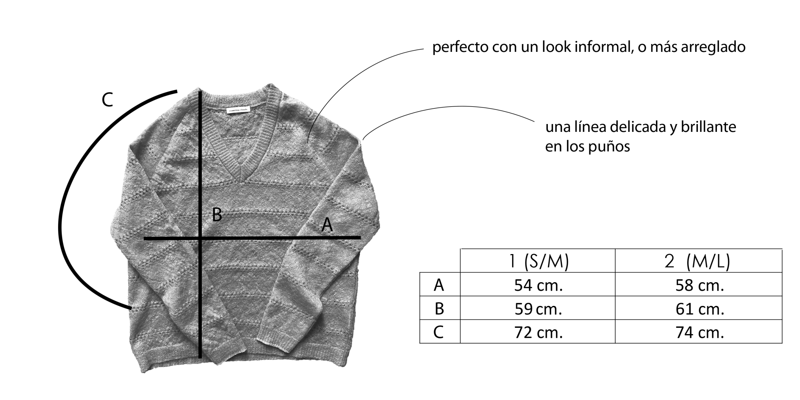 Un jumper muy ligero con un detalle delicado y brillante en los puños. Cuello pico, manga raglan y un patrón ligeramente oversize para poder combinar con varias capas. Una prenda perfecta con vaqueros o con tus looks de estas fiestas.