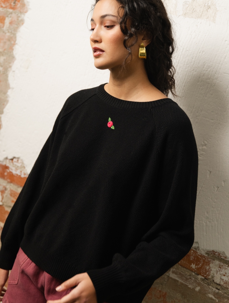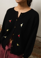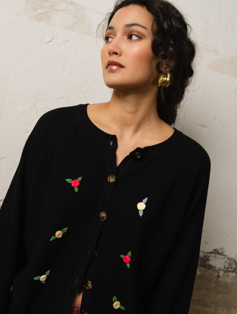 Oaxaca es delicadeza. Un cardigan reversible con unas mangas globo amplias que sientan de infarto. Puedes llevarlo como chaqueta o como jersey con los botones hacia atrás. Con rosas bordadas a mano con hilo grueso de algodón, inspiradas por el colorido de la artesanía mejicana. Uno de vuestros patrones favoritos de Counting Clouds en esta prenda súper especial.