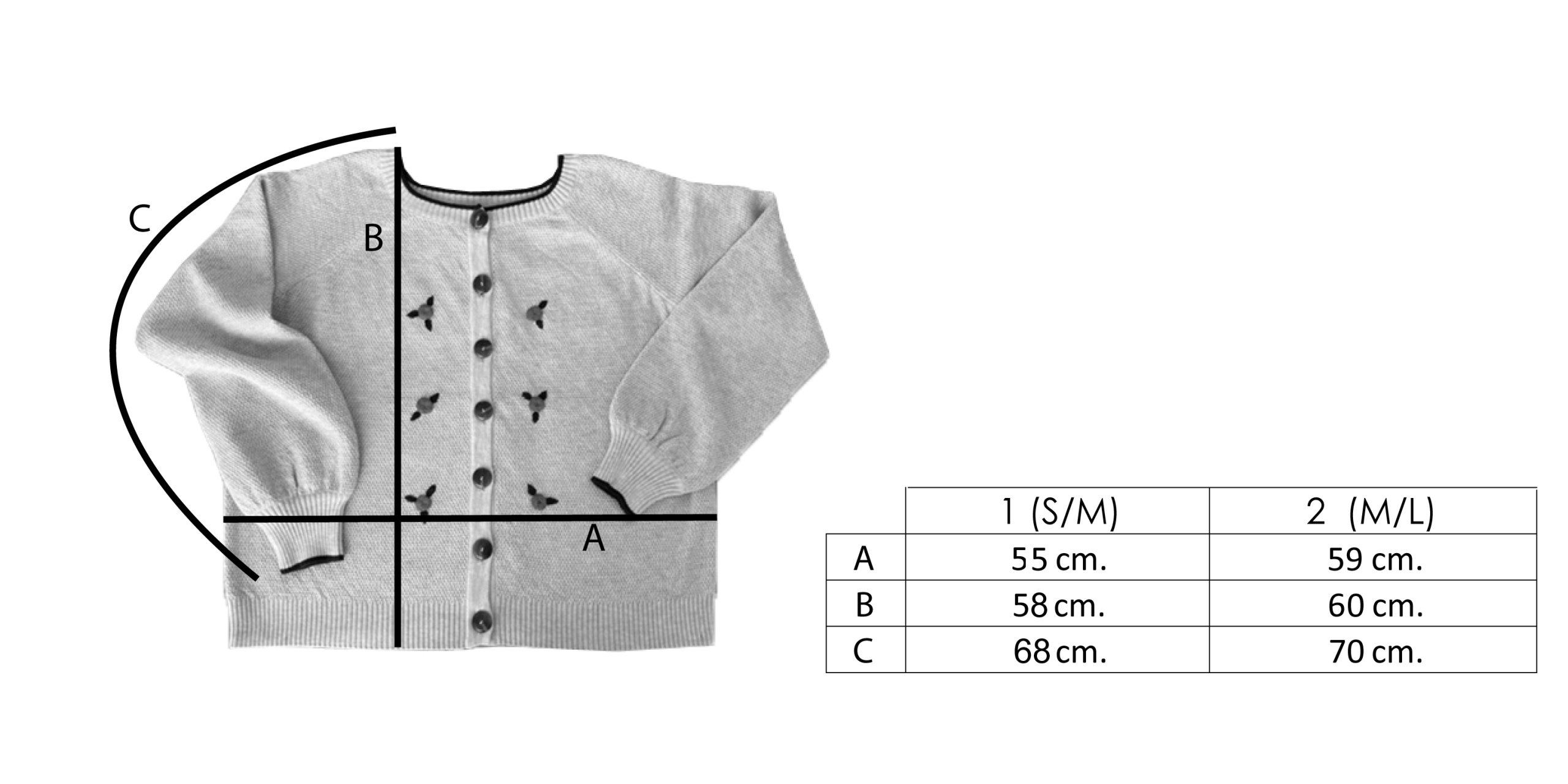 En la pestaña MEDIDAS tienes las medidas de la prenda en plano. Naciah mide 174 cm. y en las fotos lleva la Talla 2 (M/L). Si tienes cualquier duda, puedes consultarme en info@countingclouds.es y te ayudaré a escoger la talla correcta.