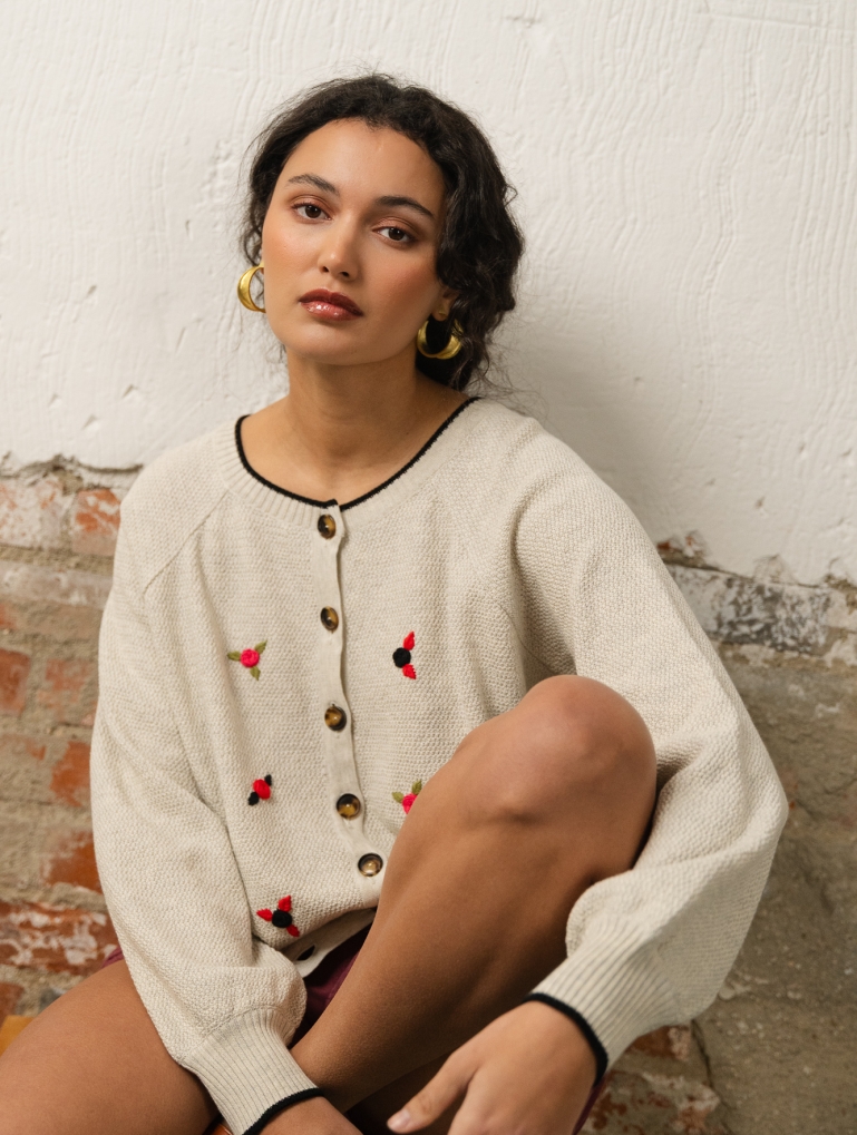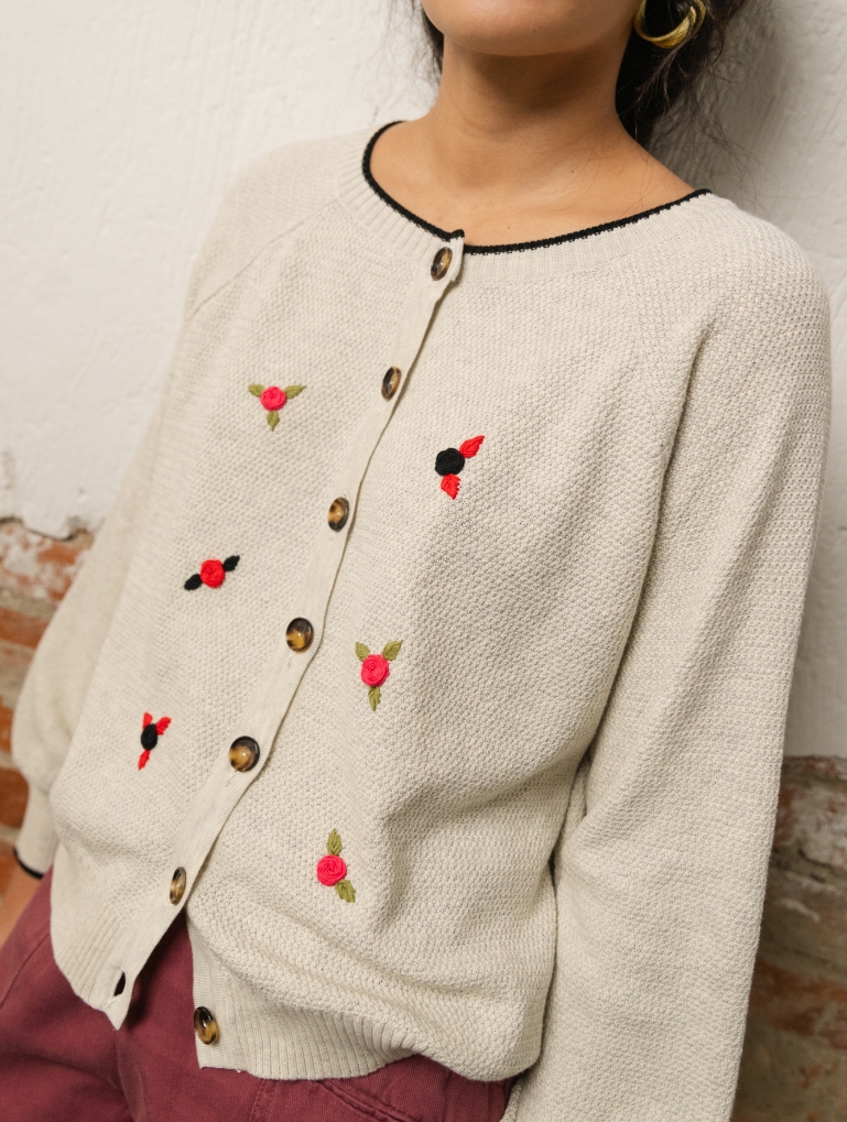 Oaxaca es delicadeza. Un cardigan reversible con unas mangas globo amplias que sientan de infarto. Puedes llevarlo como chaqueta o como jersey con los botones hacia atrás. Con rosas bordadas a mano con hilo grueso de algodón, inspiradas por el colorido de la artesanía mejicana. Uno de vuestros patrones favoritos de Counting Clouds en esta prenda súper especial.