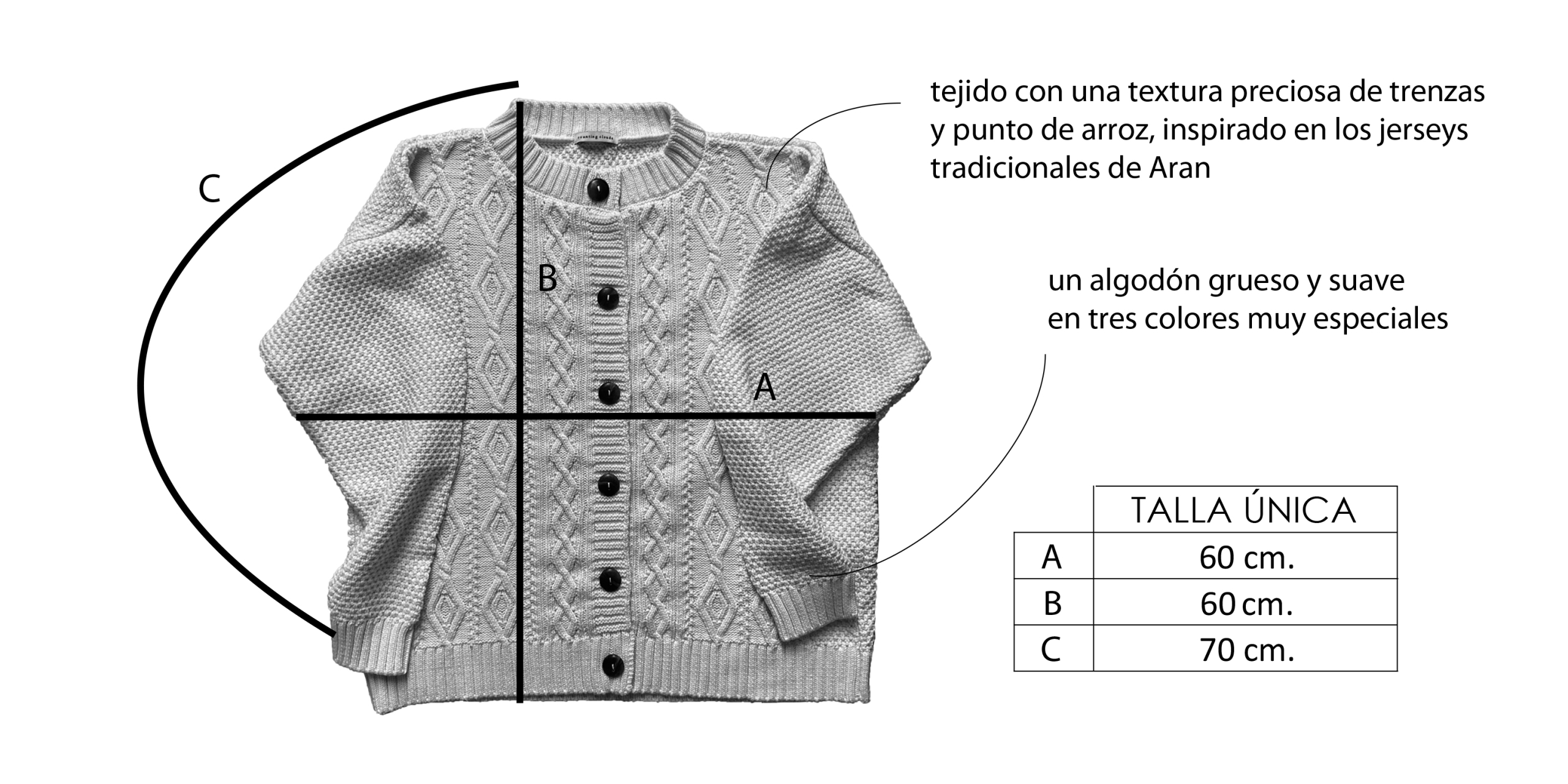 Un cardigan tejido en un algodón muy suave con una textura de trenzas y punto de arroz, inspirado por los jerseys tradicionales de Aran, que se cree que traen buena suerte, éxito y salud al que los lleva. Una prenda muy especial en unos colores ideales, perfecta para llevar cerrada o abierta y disfrutar durante todo el año.