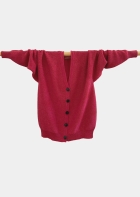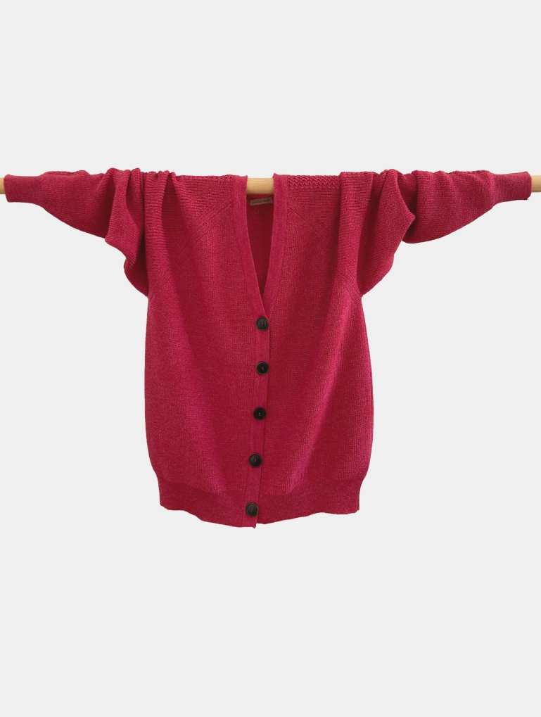 Un cardigan de manga raglan y punto perlado que hará que te sientas como en casa en los días más fríos. De corte algo oversize, puedes llevarlo encima de otro jersey o como prenda exterior. Es perfecto también debajo de un abrigo. Con grandes y preciosos botones de corozo natural y una mezcla de hilos en rojo y rosa (ver última foto).