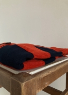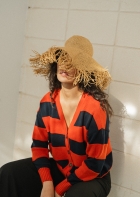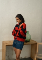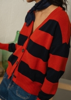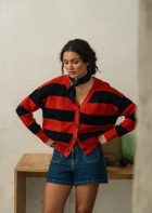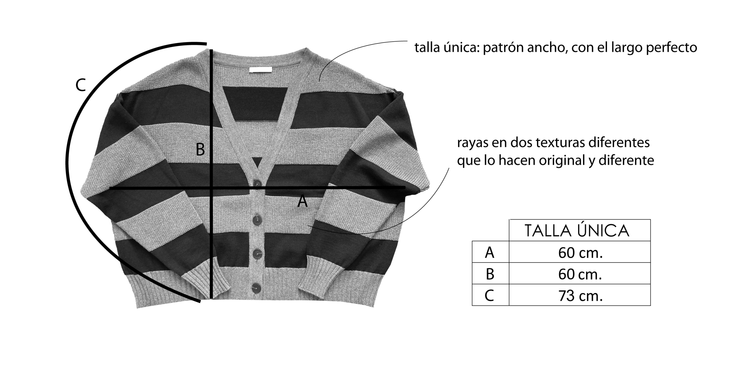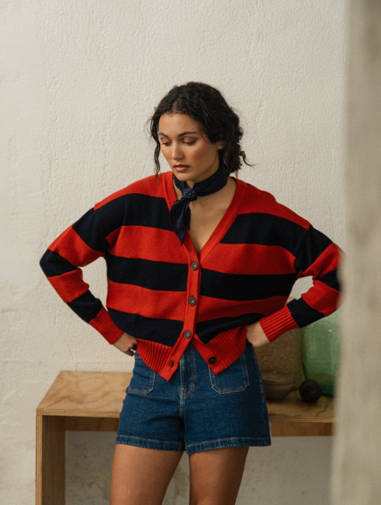 Un patrón amplio, con rayas en dos texturas diferentes que le dan movimiento a esta prenda. Su forma ancha y corta hace que quede perfecto con unos pantalones de cintura alta, abierto sobre un vestido, o sobre camisetas básicas. Mil combinaciones para una chaqueta súper favorecedora en una combinación de marino y terracota.