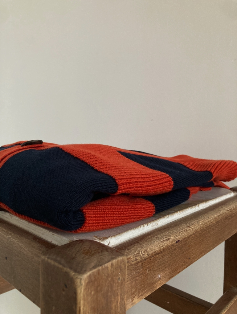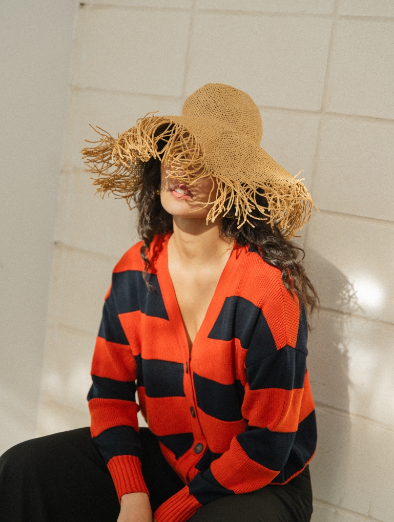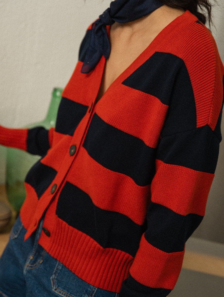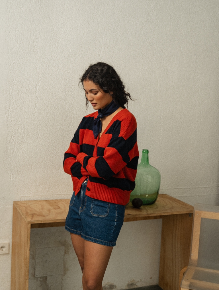 Un patrón amplio, con rayas en dos texturas diferentes que le dan movimiento a esta prenda. Su forma ancha y corta hace que quede perfecto con unos pantalones de cintura alta, abierto sobre un vestido, o sobre camisetas básicas. Mil combinaciones para una chaqueta súper favorecedora en una combinación de marino y terracota.