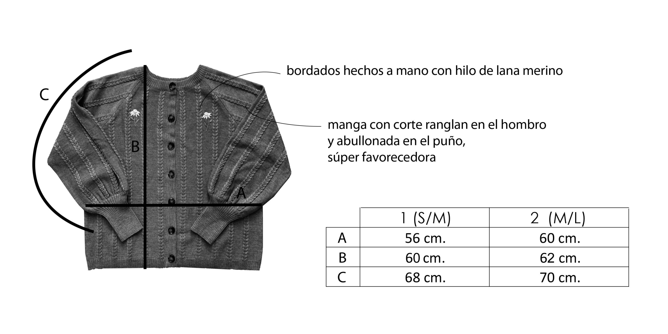 En la pestaña MEDIDAS tienes las medidas de la prenda en plano. Rita mide 170 cm. y en las fotos lleva la Talla 2 (M/L). Si tienes cualquier duda, puedes consultarme en info@countingclouds.es y te ayudaré a escoger la talla correcta. (En la producción de esta prenda, hemos encajado perfectamente las trenzas del cuerpo y las mangas).